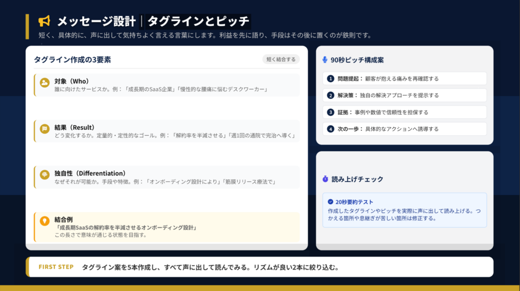 タグラインは「対象」「結果」「独自性」の3要素で構成します。利益を先に語り、手段はその後に置くのが鉄則です。