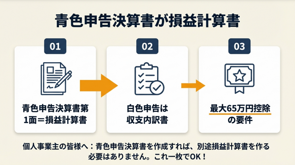 白色申告の場合は「収支内訳書」が損益計算書に相当します。青色申告決算書より項目数が少なく、売上・必要経費・所得の3段構成になっています。ただし白色申告では青色申告特別控除(最大65万円)が受けられないため、毎年の事業所得が一定額以上あるフリーランスの方は、青色申告への切り替えを検討する価値があります。控除額の差は年間の節税効果に直結するため、「どちらでも同じ」とは言い切れません。