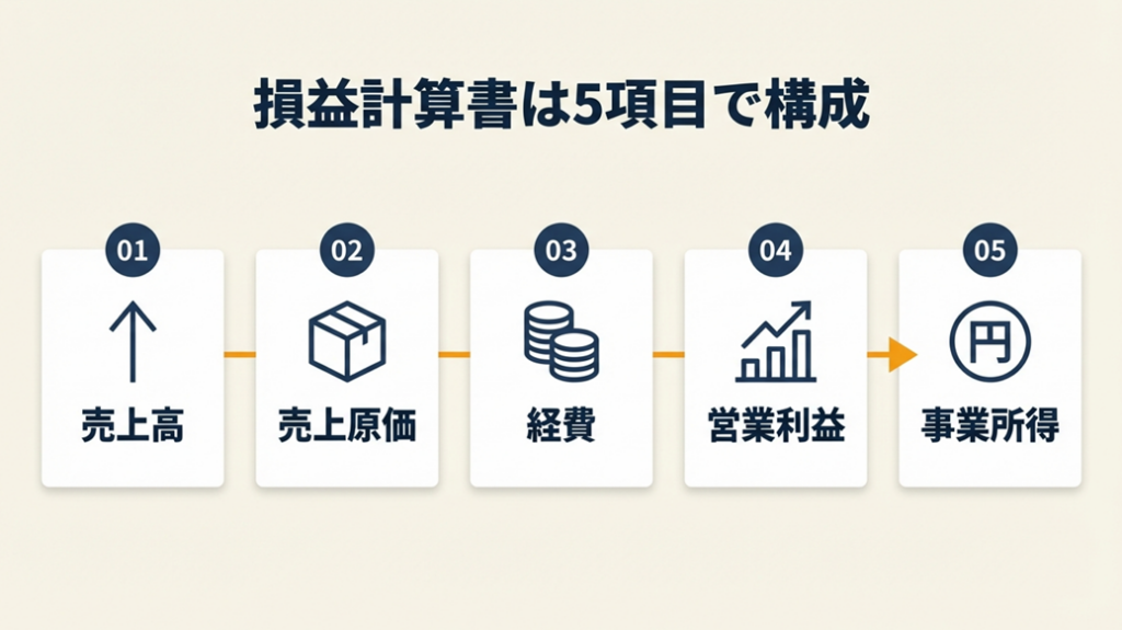 個人事業主の損益計算書は企業のものと違い、5つの主要項目を押さえるだけで基本構造を理解できます。