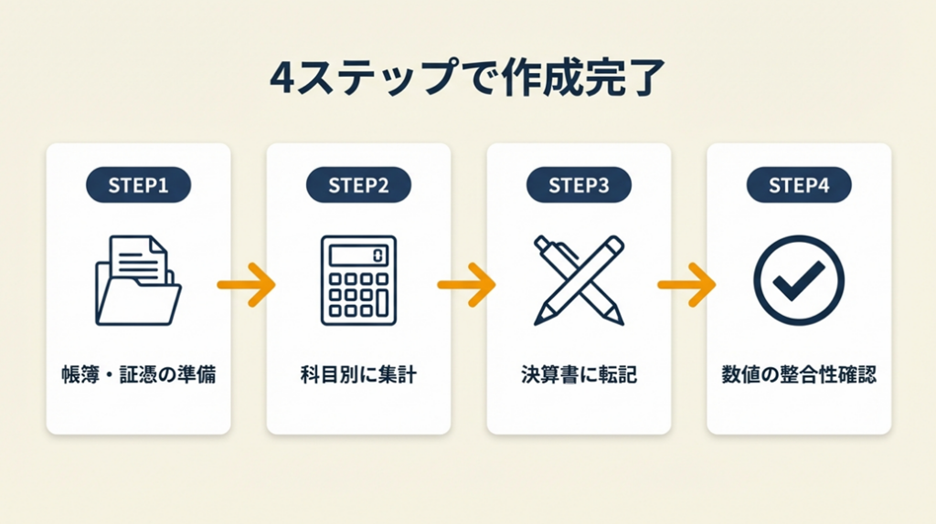 損益計算書の作成は、帳簿の準備から集計・入力・確認まで4ステップで完結します。