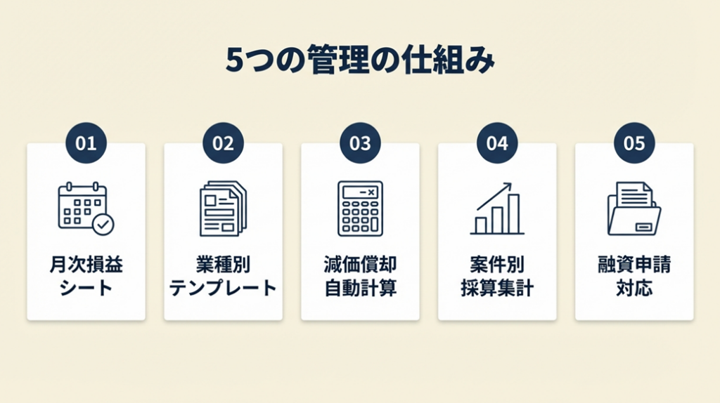 損益計算書は年1回作るだけでなく、毎月のデータ蓄積があれば事業判断に使える強力なツールになります。月次の簡易集計を習慣化することが、年末の確定申告作業を最も楽にする方法です。以下に、フリーランス・個人事業主が実務で使える5つの仕組みを紹介します。