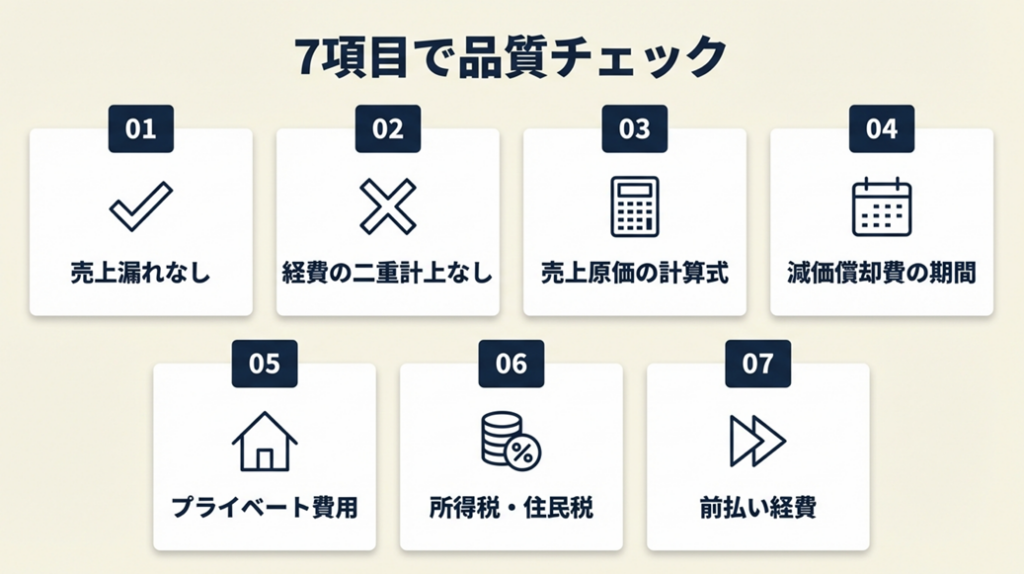 書き上げた損益計算書に誤りがないか確認したい場合、以下の7項目を順番に確認するだけで主要なミスを自力で発見できます。