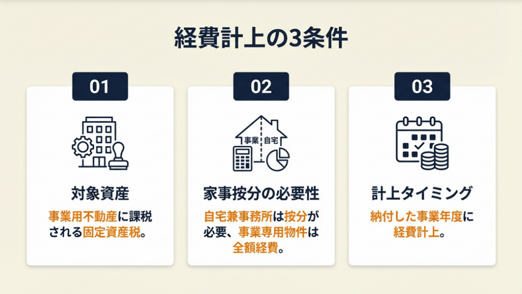 経費計上できる固定資産税は、事業の遂行に直接必要な資産に課税されるものです。具体的には、事業専用の土地・建物・機械設備などが対象になります。国税庁タックスアンサー No.2210によれば、業務の遂行上必要な部分が明らかに区分できる費用は必要経費に算入できます。「事業専用スペースがどこか」を物理的に説明できることが、経費計上の前提条件になります。