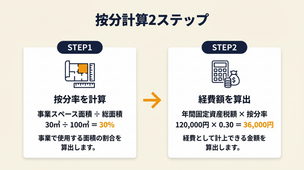 按分計算のやり方がわからなくて申告をためらっている方も多いです。2ステップで計算できるシンプルな方法があるので、手順通りに進めれば迷わない。