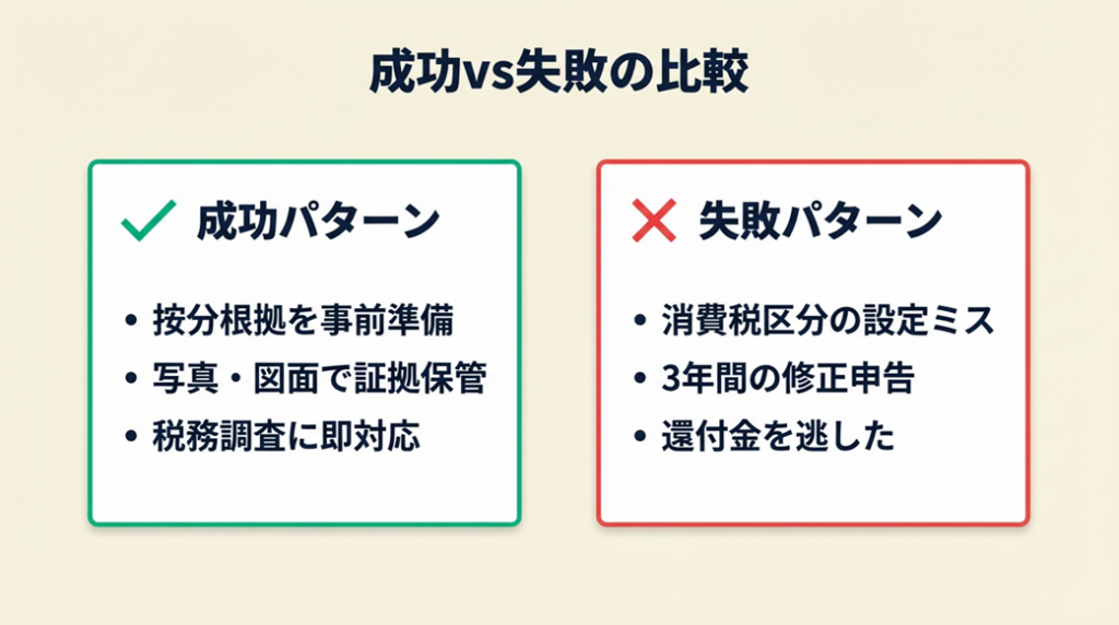 • 【なぜ効くのか】: 税務調査では申告内容の説明責任は納税者側にあります。写真・図面・計算書という三点セットが揃っていれば、税務調査官が「事業実態の確認」のために追加質問をする必要がなくなります。結果として調査が短時間で完了し、指摘事項がゼロになる可能性が大幅に高まる。