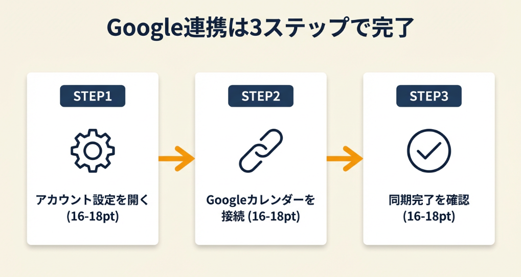 Google カレンダーと同期できるかどうかは、ツール選びの大きな分岐点です。確認すべきポイントは「同期の方向」「リアルタイム性」「追加設定の有無」の3点です(Google Workspace 公式)。