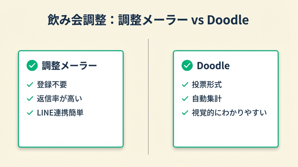 飲み会など親しい間柄では調整メーラー、取引先を含む半公式な集まりには Doodle の有料版が向いています。「参加者に対してどの程度の丁寧さが必要か」で使い分けてください。