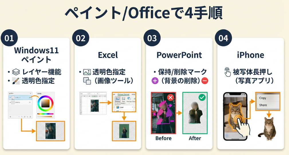 Windows11のペイントやOfficeソフトでも透過処理は可能で、用途や環境に応じて最適な方法を選べます。オンライン環境がなくても、PowerPointの背景削除機能があれば対応できます。
