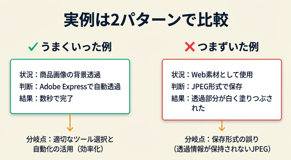 結果: 保存後に画像を開くと、透過部分が白く塗りつぶされていた。やり直しが発生し、30分のロスになった。