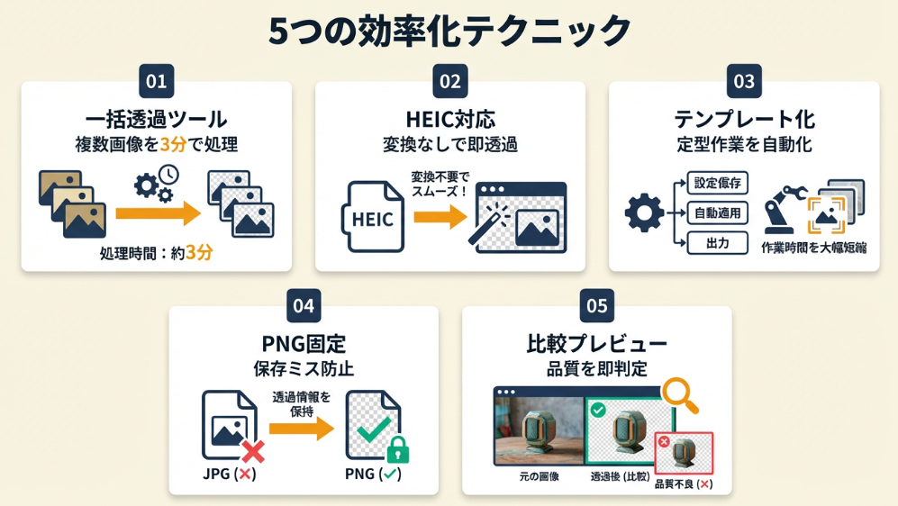 【なぜ効くのか】画像透過の大半はAI自動処理で十分な品質が得られるため、まとめて処理してから問題のある画像だけ個別対応する方が効率的です。