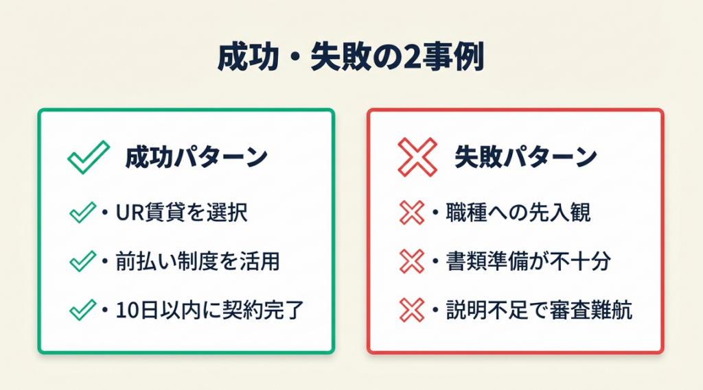 もし民間賃貸へのこだわりを続けていれば、職業を理由にさらに審査落ちが続いていた可能性があります。物件タイプを切り替える判断の早さが入居までの期間を大きく短縮した事例です。