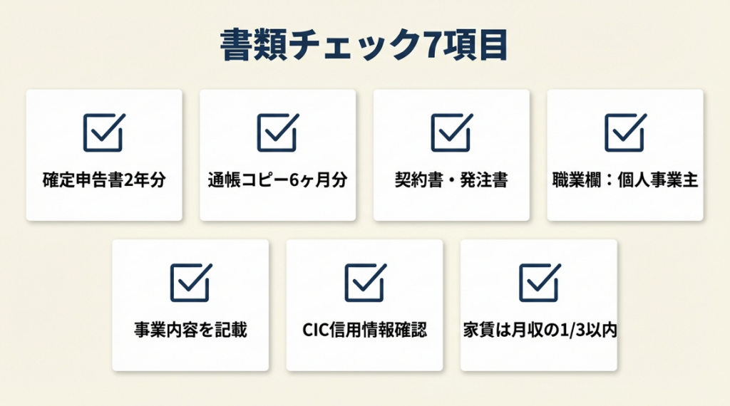 通りやすい物件タイプを選んでも、書類の準備が不十分なら審査は通りにくくなります。以下の7項目を申込前に確認してください。