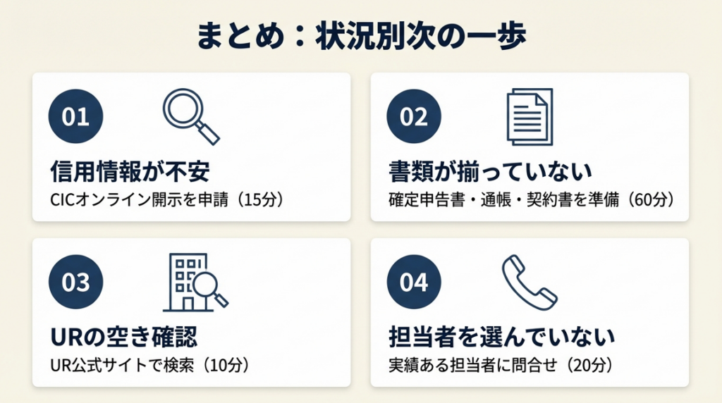審査落ちが続いても、それは「フリーランスだから無理」という意味ではありません。落ちた理由の多くは「物件タイプのミスマッチ」か「書類不備」であり、どちらも対処可能です。一つひとつ原因を潰して前に進んでください。