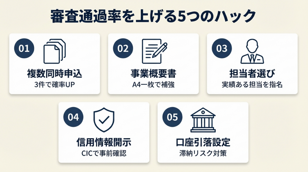 以下のハックは、一般的な「書類を揃えましょう」というアドバイスにとどまらず、審査の構造を踏まえた実践的な戦略です。