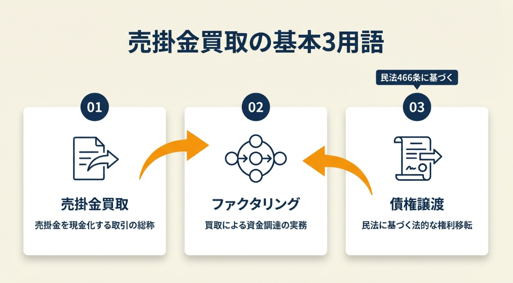 売掛金買取、ファクタリング、債権譲渡。似た用語が3つ並ぶと混乱します。ここでは3つの用語の関係を整理し、即日買取の仕組みを明確にします。
