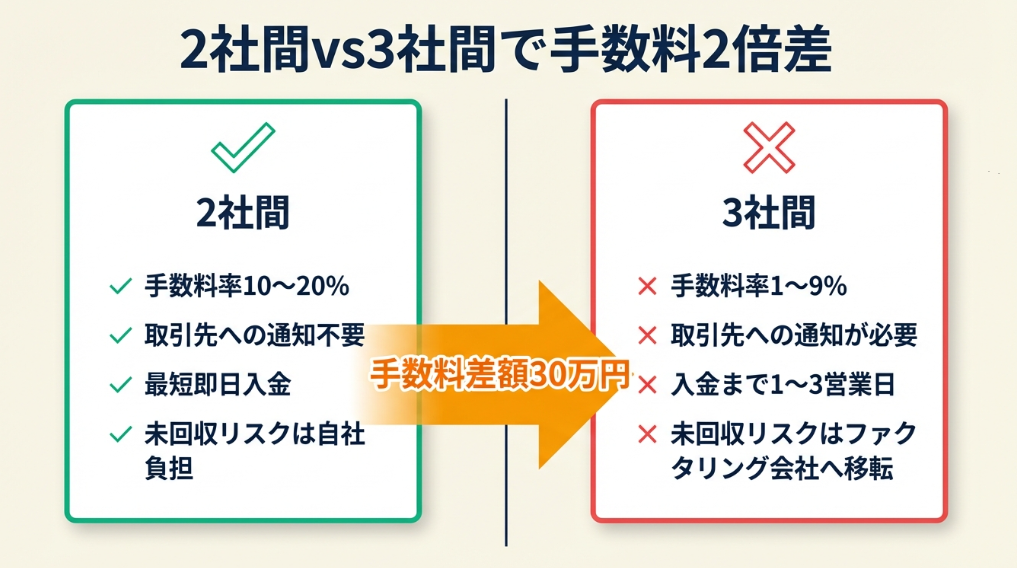 売掛金300万円を買い取る場合、2社間(手数料15%)は45万円、3社間(手数料5%)は15万円です。差額30万円を「取引先に知られない保険料」として許容できるかが判断基準です。年間で複数回利用するなら差額は数百万円に膨らむため、安易に2社間を選ぶのは避けてください。