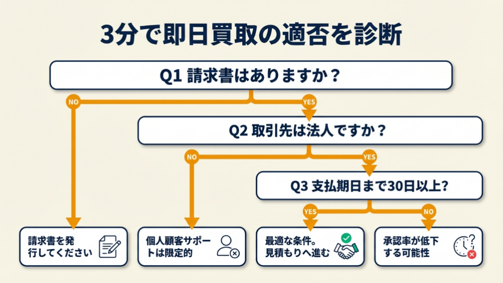 自社の状況で即日買取が使えるかどうか、3つの質問で判定できます。