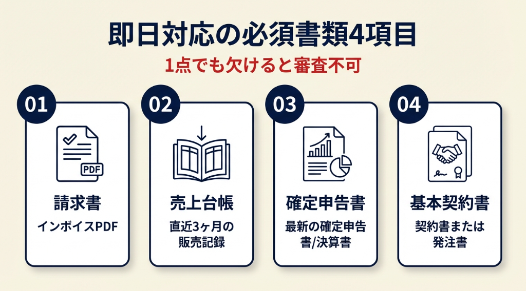 A: 4点です。請求書・売上台帳・確定申告書・基本契約書が揃えば審査開始できます。1点でも欠けると審査に入れないため、申込前に確認してください。