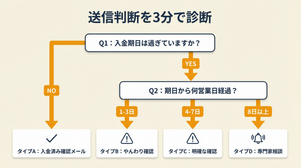 「今送るべきは確認メールか催促メールか」と迷う方も多いです。この診断で、あなたの状況に合ったアクションを3分で判定できます。本内容は2026年2月時点の法令に基づいています。
