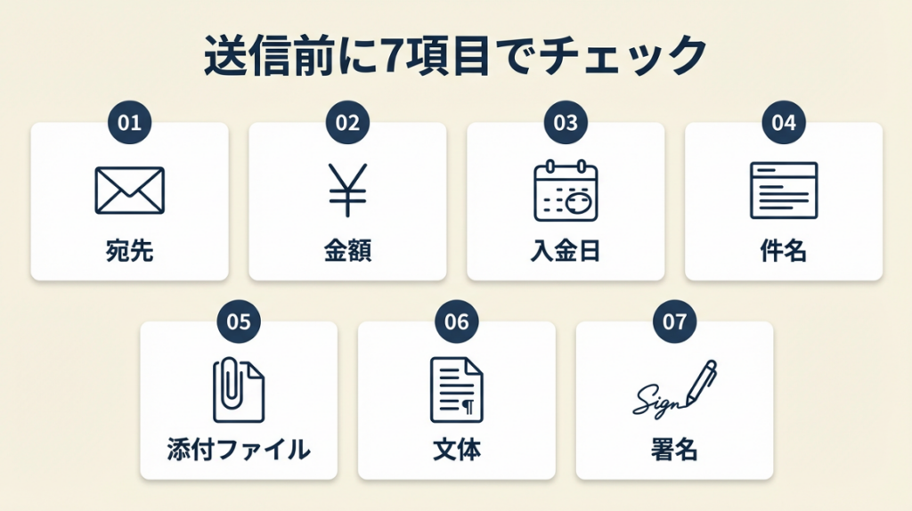 なぜ効くのか: 2〜3営業日は「相手の通常業務サイクルの1巡」に相当します。一般的なビジネスでは週次で経理処理が行われる企業が多く、最初のメールを見落とした場合でも「次のサイクル」で対応できるタイミングです。
