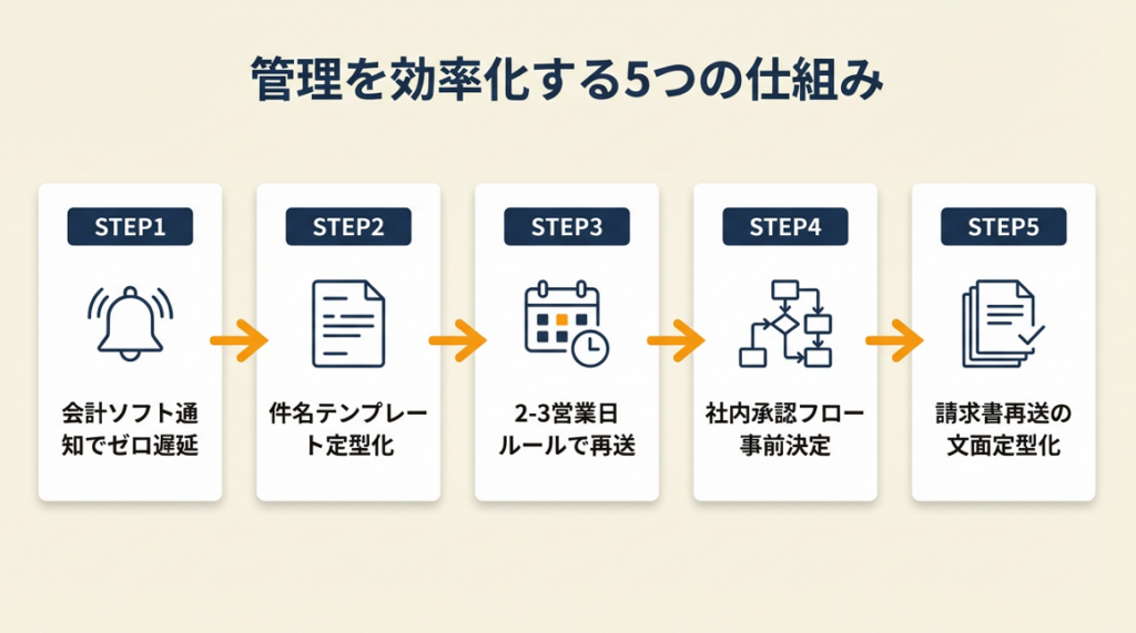 入金確認メールの運用を仕組み化することで、フリーランスの請求管理全体が安定します。5つの仕組みを導入することで、1件あたり5分以内で完結できます。
