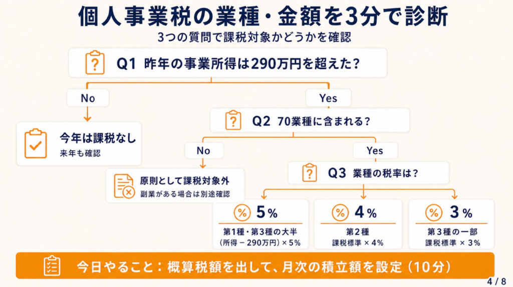 -> 昨年度の事業所得から290万円を引いた金額を計算し、該当税率(3〜5%)を掛けて概算税額を把握する(5分)