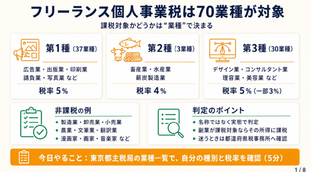 | 自分の業種が課税対象か確認したい | フリーランス個人事業税は70業種が対象 | 3分 |