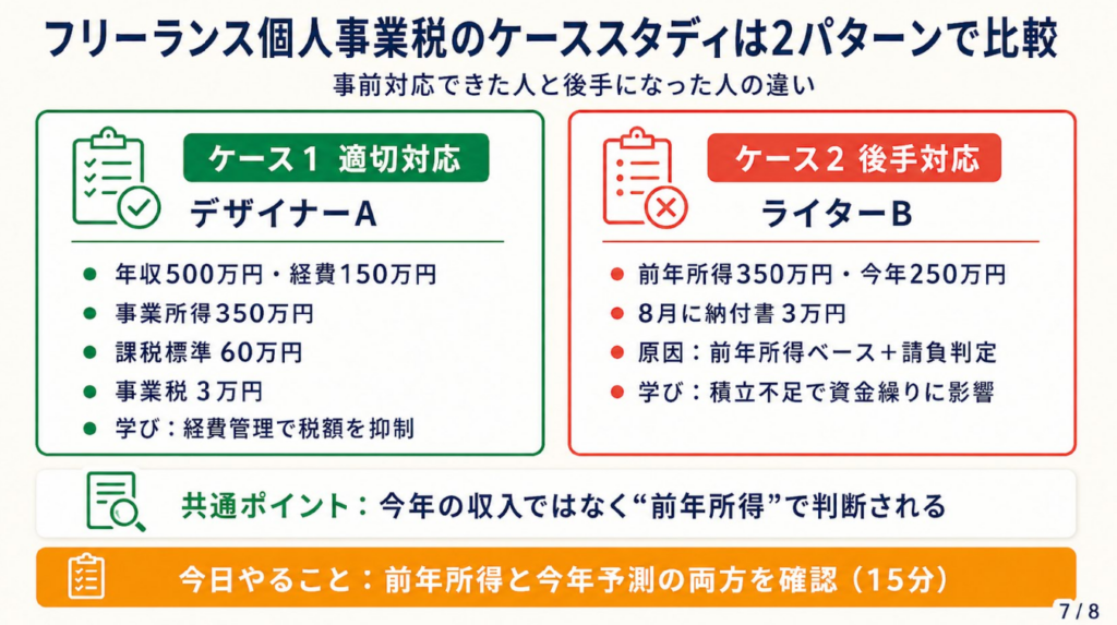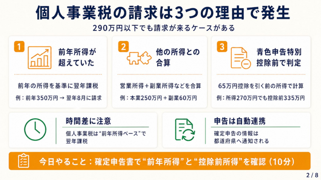 | ① 前年所得が超えていた | 個人事業税は前年の所得を基準に翌年課税 | 前年350万円 → 翌年8月に請求 |