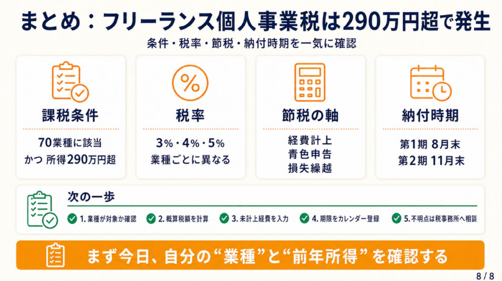 フリーランスの個人事業税は「課税対象70業種かつ所得290万円超」の条件を両方満たした場合に、税率3〜5%で発生します。有効な節税策は経費の適切な計上と青色申告65万円控除の活用であり、いずれも確定申告の準備段階から着手することが重要です。