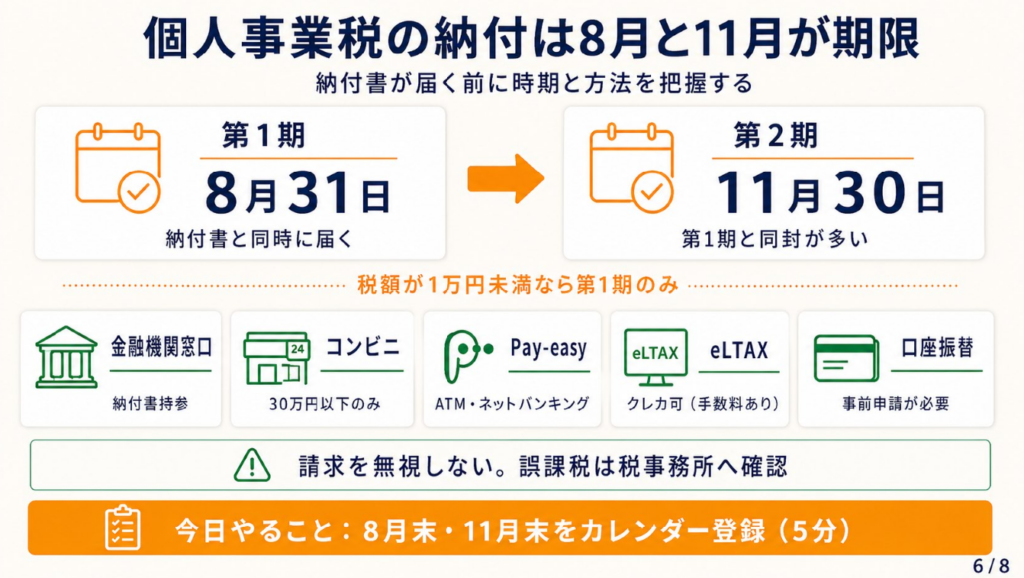 -> 納付書が届いたら第1期(8月末)と第2期(11月末)の日付をカレンダーに登録し、支払い方法を今月中に決定する(5分)