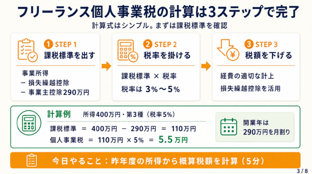 | 計算方法と実際の金額を知りたい | フリーランス個人事業税の計算は3ステップで完了 | 5分 |
