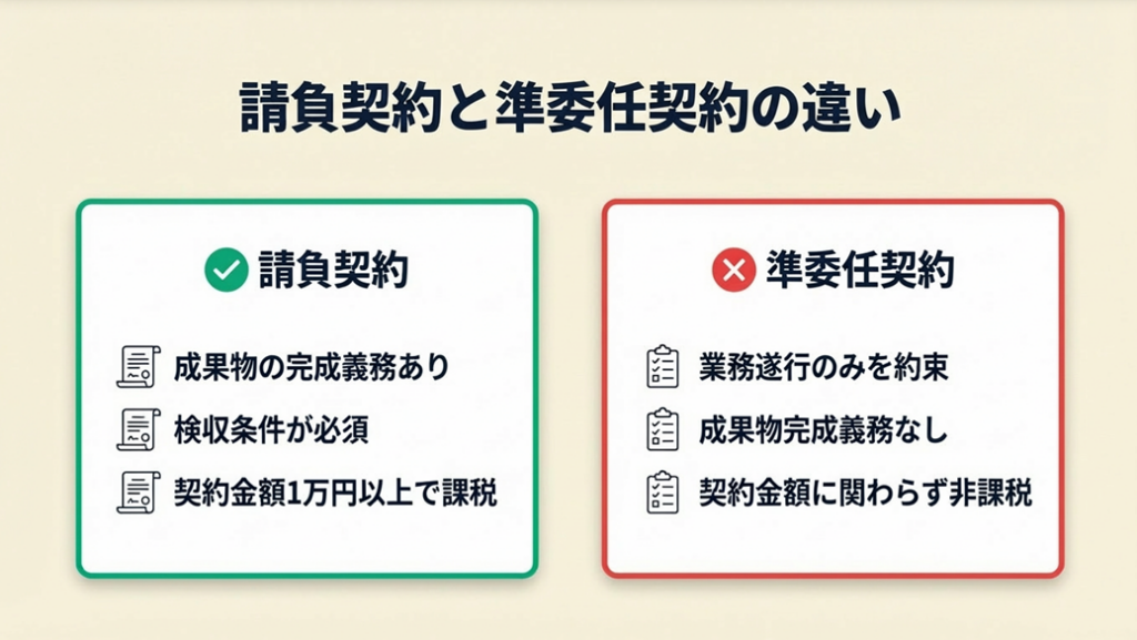 - 【注意点】: 業務実態が「成果物の完成を保証している」にもかかわらず、書類の表記だけを「準委任」にした場合、税務上は請負として扱われます。実態と一致した形式を選んでください。