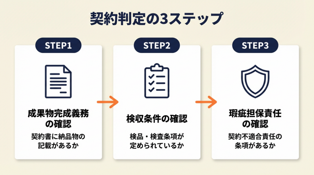 -> 手元の業務委託契約書に「成果物の完成義務」「検収条件」「瑕疵担保責任」の3点があるかを確認し、請負か準委任かを特定する(10分)