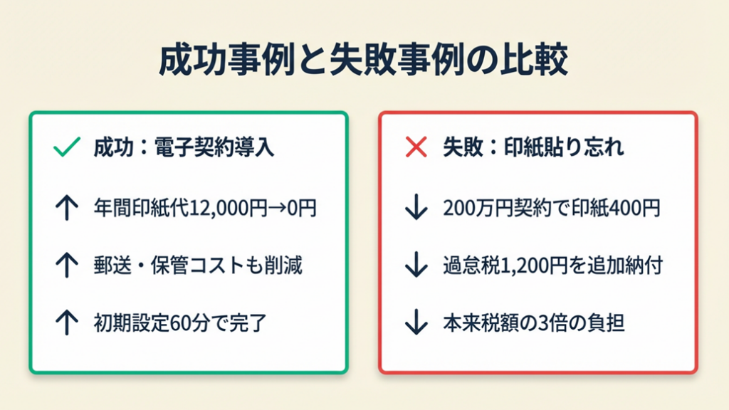 電子契約サービスを導入して印紙代ゼロを実現したフリーランスの報告は、複数の導入事例で確認されています。