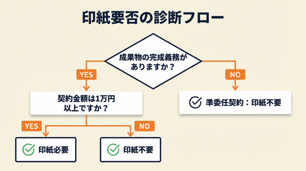 「自分の業務委託契約書は印紙が必要か?」を3分で判定できます。フローに沿って確認してください。