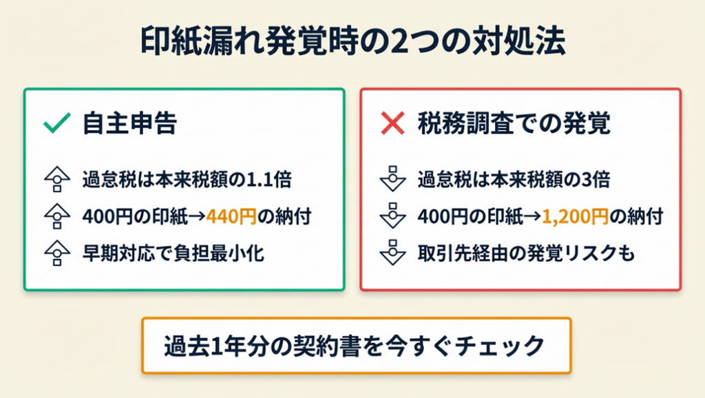 税務調査で発覚した場合、過怠税は原則として本来税額の3倍となります。400円の印紙なら1,200円の追加納付です。実務上は税務調査中であっても印紙税不納付事実申出書を提出することで1.1倍に軽減されるケースがあるとされています。見落としがちなのは「取引先への税務調査で自分の契約書の印紙漏れが発覚するケース」であり、自社の税務調査だけをケアしていても十分ではないことを把握しておいてください。