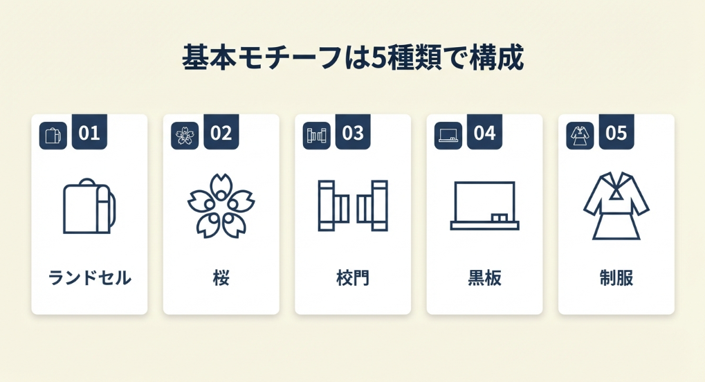 入学式イラストの核となるモチーフは5つに集約できます。この5種を組み合わせるだけで「入学式らしさ」が伝わるイラストが完成します。配色の方向性まで整理しておくと、クライアントへの提案時に迷いがなくなります。