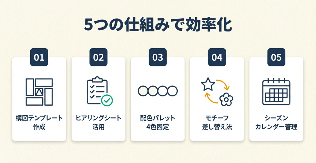 フリーランスとして案件を効率化するには、構図テンプレート・ヒアリングシート・配色パレット・モチーフ差し替え・シーズンカレンダーの5つの仕組みが有効です。構図テンプレートは一度作れば繰り返し使えるため、投資対効果が最も高い施策です。