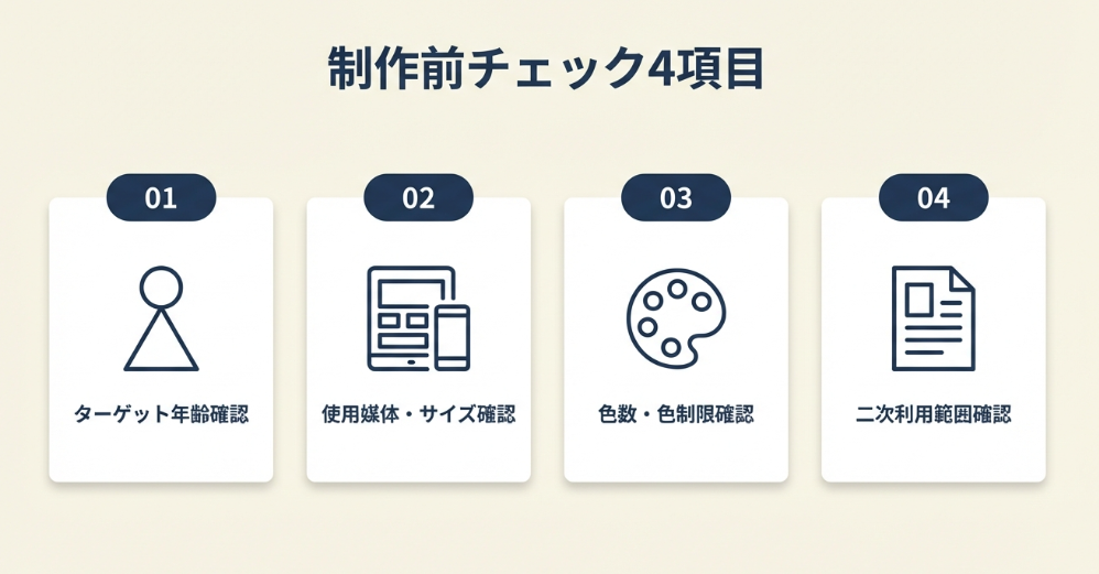 - ヒアリングシートに以下5項目を記載してください:「ターゲット年齢」「使用媒体」「希望テイスト(参考画像あれば添付)」「色数・色の制限」「二次利用範囲」(10分)