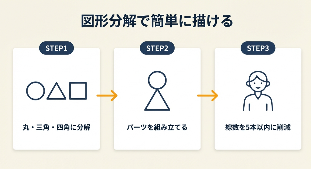 手書きイラストのコツは、複雑な形を丸・三角・四角に分解して組み立てることです。定規やコンパスがなくても、フリーハンドで安定した形が描けます。この方法を習得すると、30分で入学式イラストのラフが2〜3案作れます。