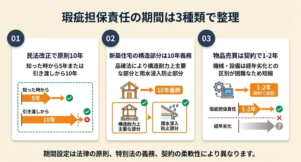 瑕疵担保責任の期間は、民法改正で原則として知った時から5年または引き渡しから10年です。新築住宅の構造部分等は品確法で10年、ソフトウェアは契約で1年程度が標準です。