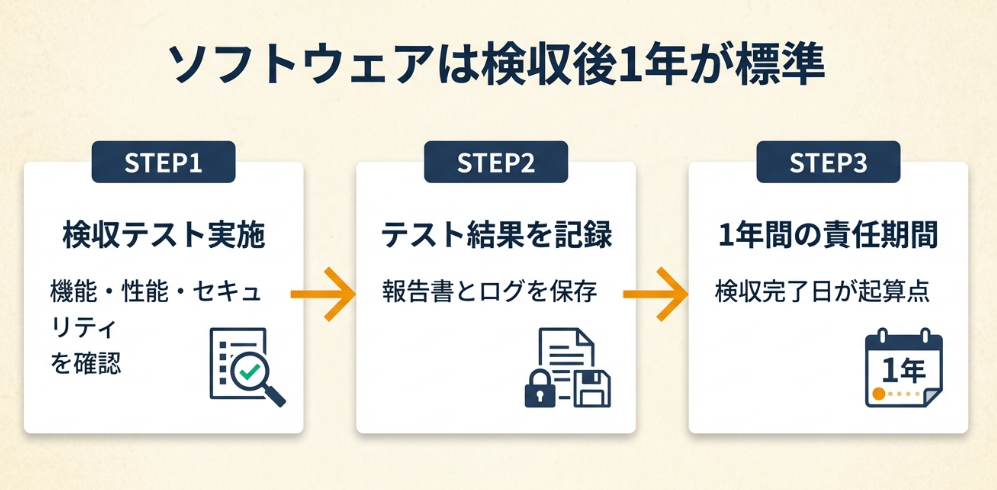 ソフトウェア開発契約では、瑕疵担保責任期間を「検収後1年」と定めるのが業界標準です。