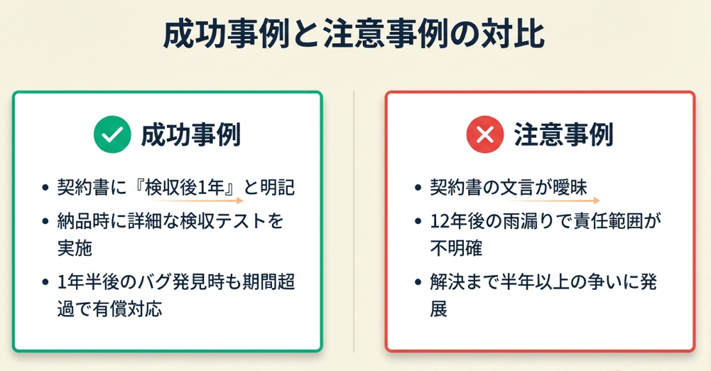 契約書で期間を明確化したソフトウェア開発会社のプロジェクトマネージャーは「納品1年半後にバグ発覚したが、特約で責任免除でき助かった」と振り返っています(ソフトウェア開発での瑕疵トラブル体験)。