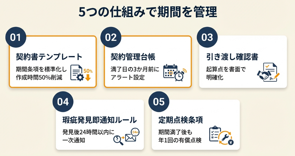 契約書に期間・起算点・通知義務を明記し、引き渡し時の記録を残してください。期間管理を怠ると、権利を失ったり、逆に予期せぬ責任を負ったりするリスクがあります。