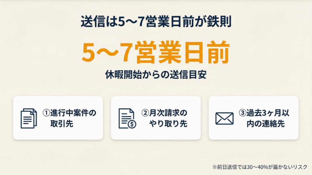 送信タイミングを誤ると、取引先が休暇期間中に連絡を取ろうとしてトラブルになるケースが少なくありません。いつ送るべきかを押さえてから、テンプレートの準備に入ってください。