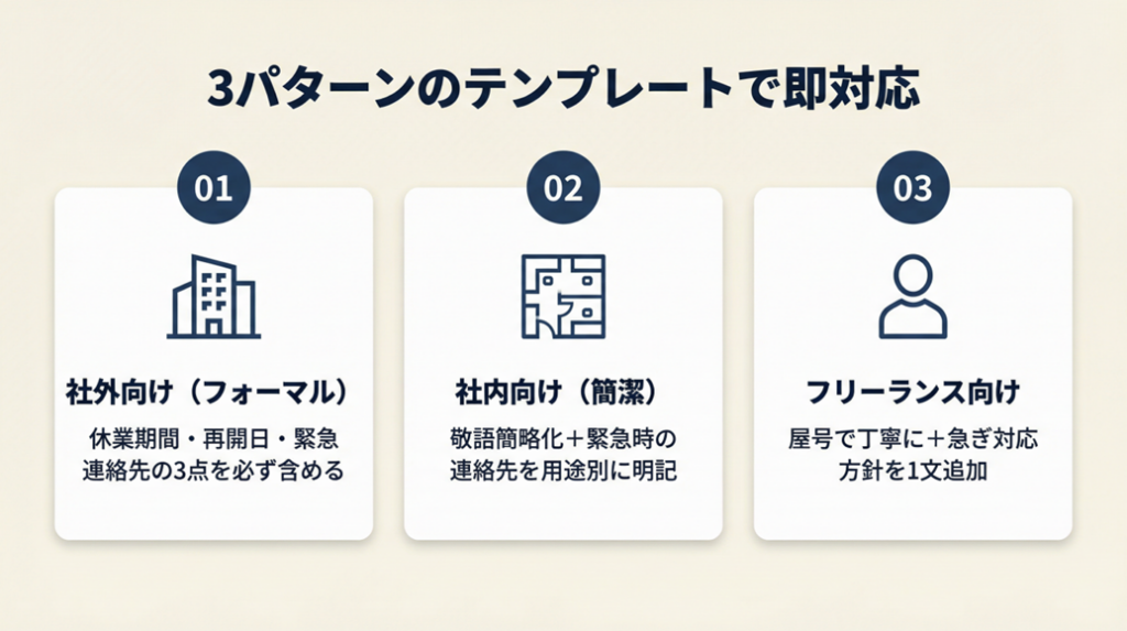 社外向けメールはフォーマル調を基本とし、「休業期間」「再開日」「緊急連絡先(必要な場合)」の3点を必ず含めます。以下のテンプレートをそのまま使用してください。