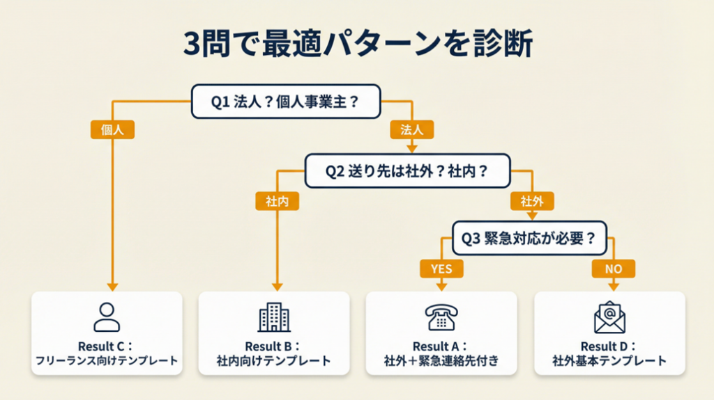 | 自分の状況がどのパターンか確認したい | 夏季休暇メールの送り方を3分で診断 | 3分 |