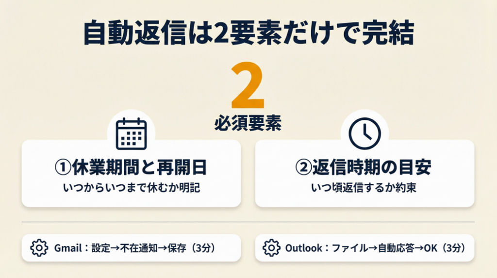 自動返信はあくまで「メールを受信した相手への対応」であり、事前告知メール(こちらから送るメール)とは別物です。自動返信だけを設定して事前告知を省略した結果、取引先から「知らなかった」と言われたケースは珍しくありません。両方を組み合わせることで初めて完全な対応になります。