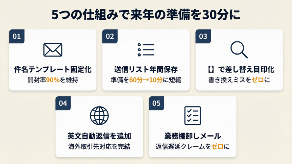 - 【効果】: 件名固定化で毎年の検討時間をゼロにし、開封率を90%以上に維持