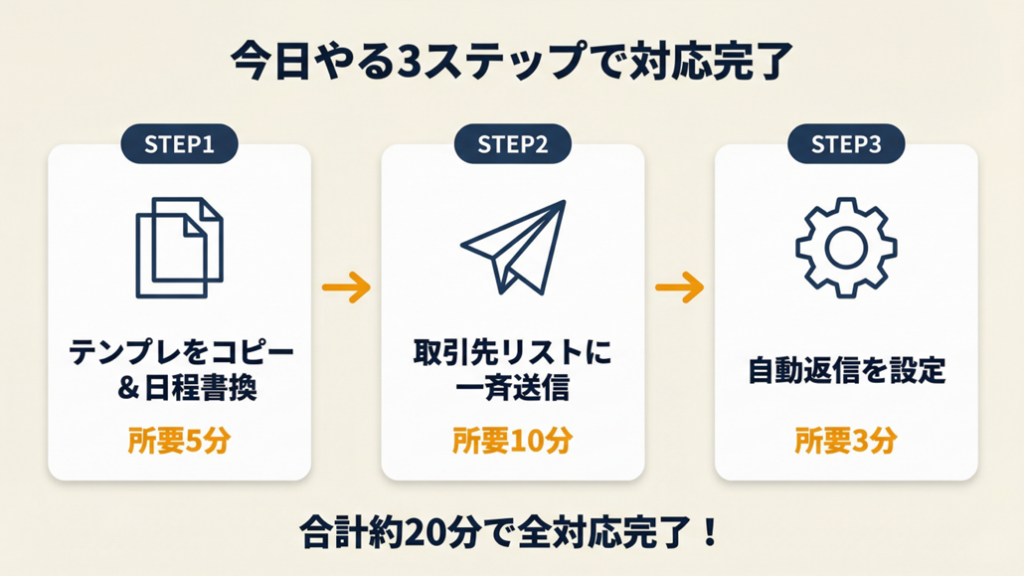 毎年「何を送ればいいか分からない」という状態から、今年こそ「1週間前に確実に送信完了」という状態に変えてください。今日取り組むべきことは1つ、社外向け基本テンプレートをコピーして日程を書き換え、取引先リストに一斉送信することです。